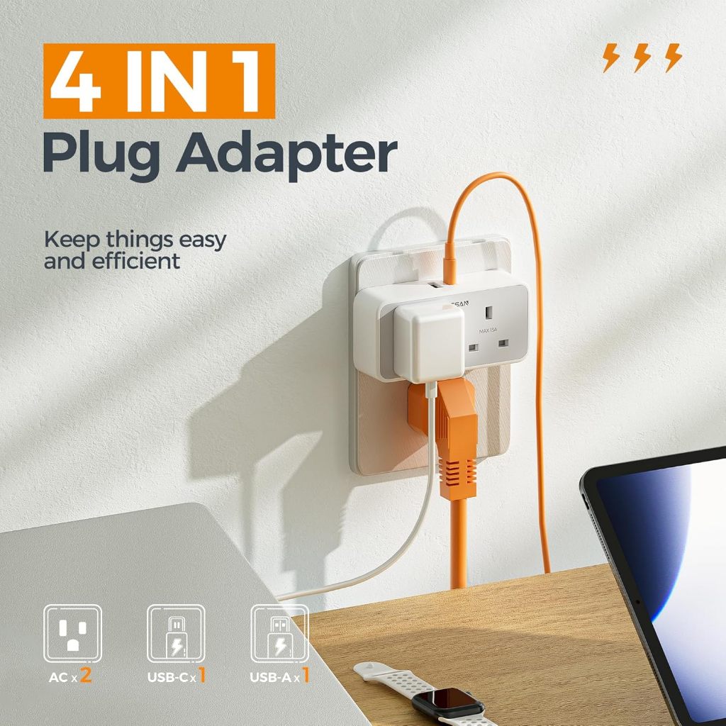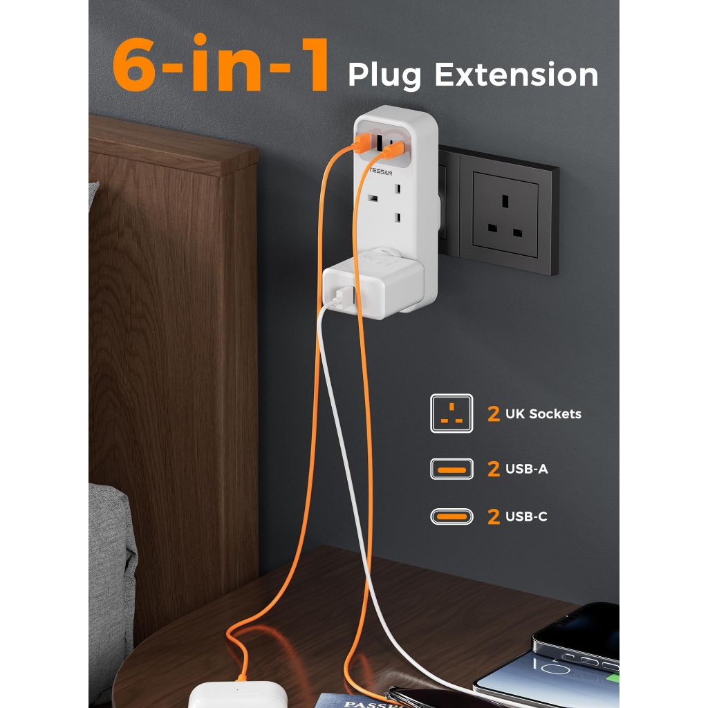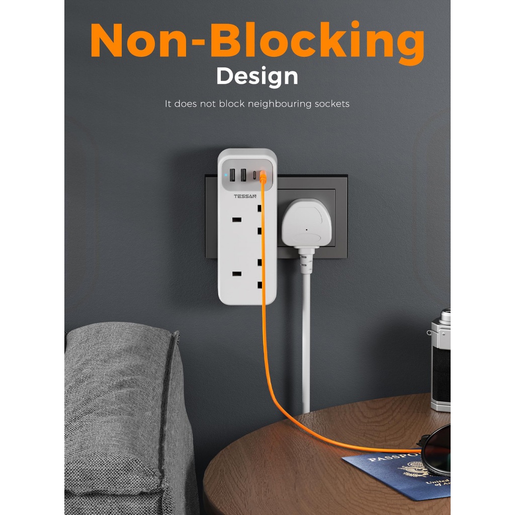 TESSAN Multi Plug Extension Adapter with USB+Type C,Power Extension Socket Adaptor Safety Mark