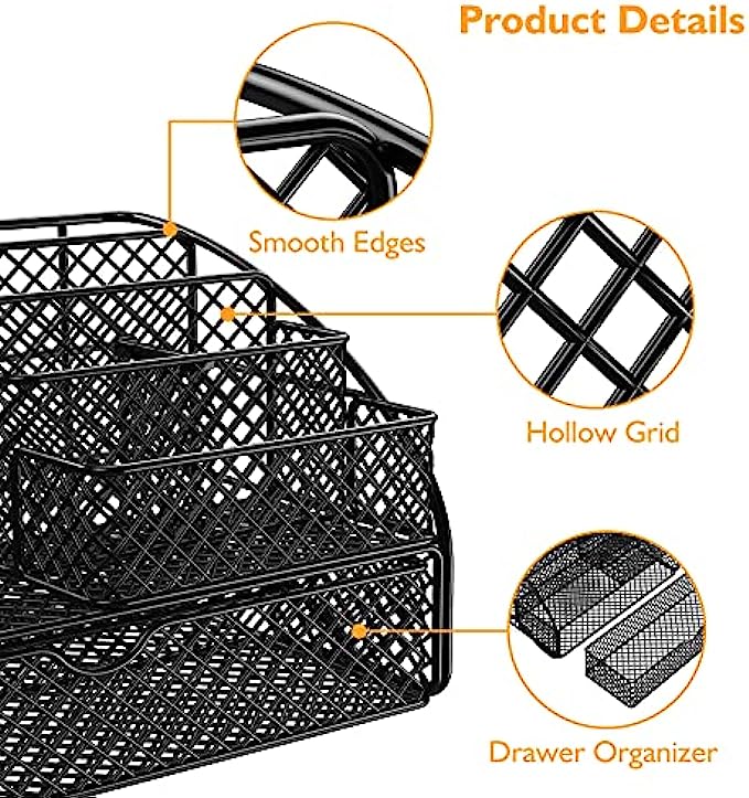 【Sturdy & Stylish】: Mesh desk organizer is made of quality mesh metal, durable sturdy, stylish, compact appearance. No impossible to bend or scratch with normal daily use. This desk caddy won’t wobble, when you pull out the drawer. Suitable for busy professionals, bloggers, students, teachers, and more.