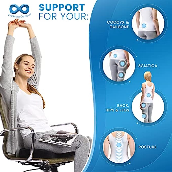 Everlasting Comfort Seat Cushion Pillow for Office Chair - Sit Longer, Feel Better - Butt, Tailbone, Back, Coccyx, Sciatica Memory Foam Cushions - Computer Desk Pain Relief Pad