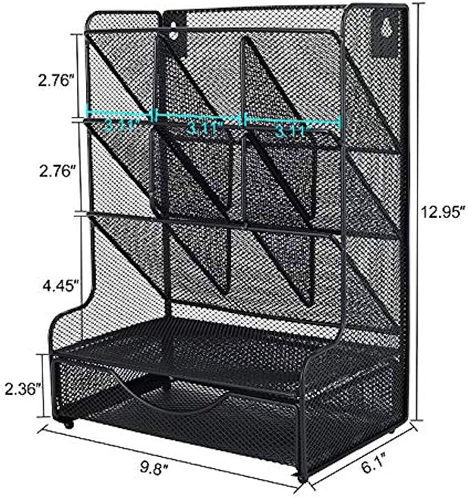 PAG Desk Organizer with Drawer Office Supplies and Accessories Storage Caddy Hanging Wall Shelf Metal Mesh Pencil Holder for Kids, 9 Compartments, Black