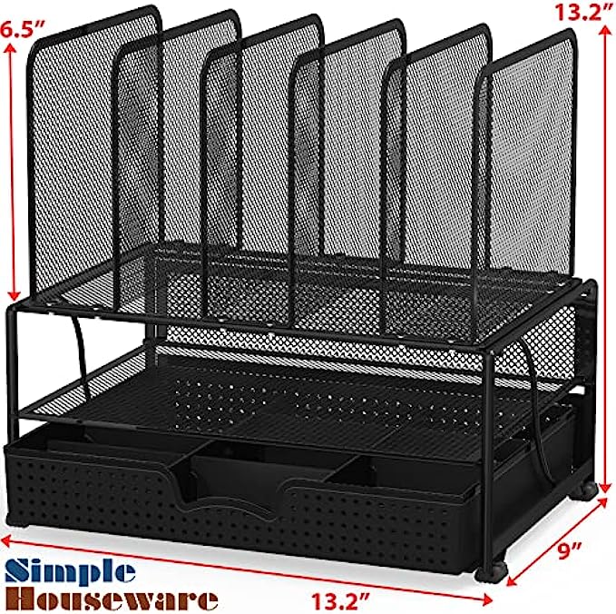 SimpleHouseware Mesh Desk Organizer with Sliding Drawer, Double Tray and 5 Upright Sections, Black