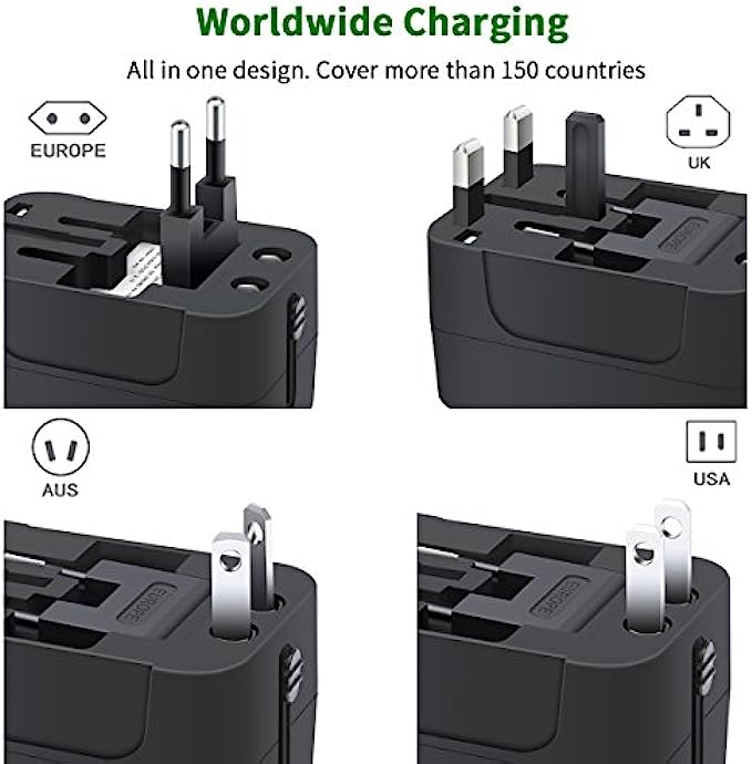 • UNIVERSAL WORLDWIDE CHARGING - This travel adapter Accepts Plugs from More than 150 Countries with US/EU/UK/AU european Plugs like Thailand, New Zealand, Israel, Italy, Rome, France, Spain, Canada, China, Australia, India, Hong Kong, Argentina, Peru, Korea, Asia, etc