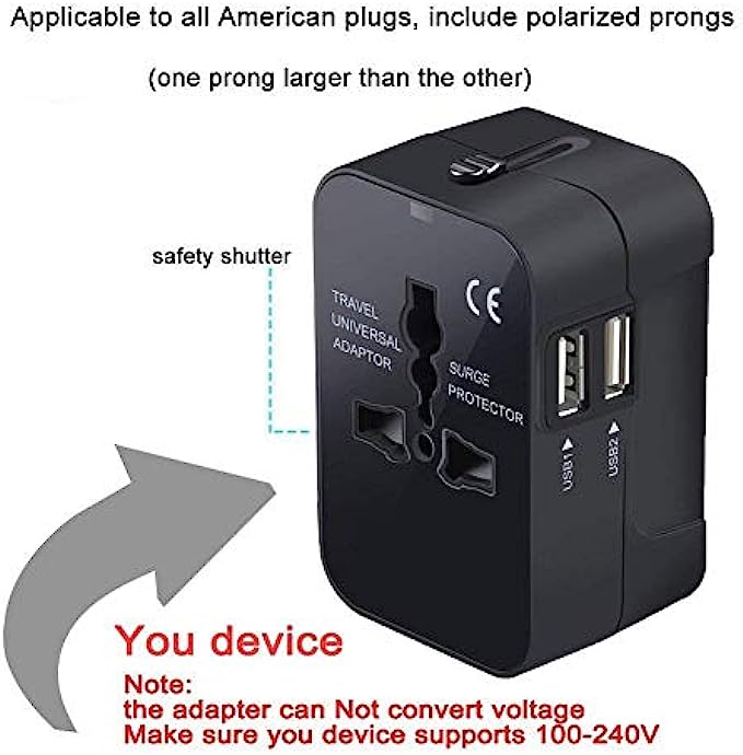 • DUAL USB CHARGING PORTS - World Adapter Plug compatible with almost all USB Devices like Apple iPhone x 8 8 plus 7 7s 6 6s 5s 4s, Sony, Blackberry, HTC, Lenovo, LG, ZTE, Huawei, and so on.