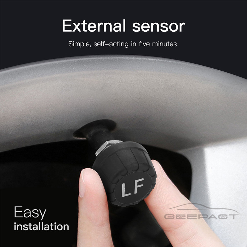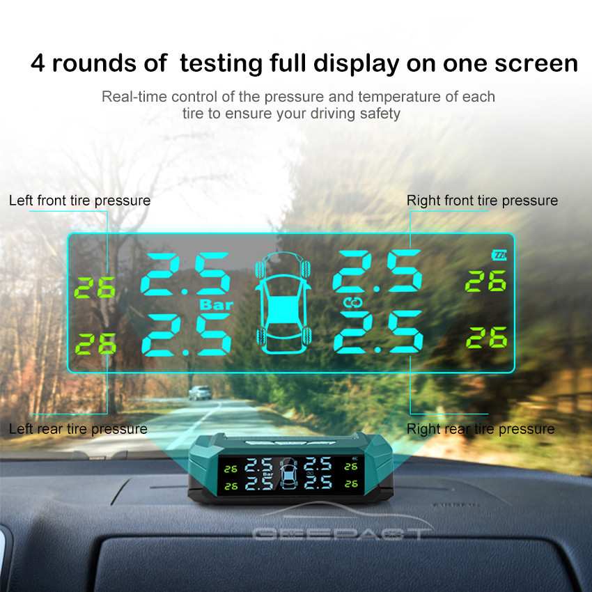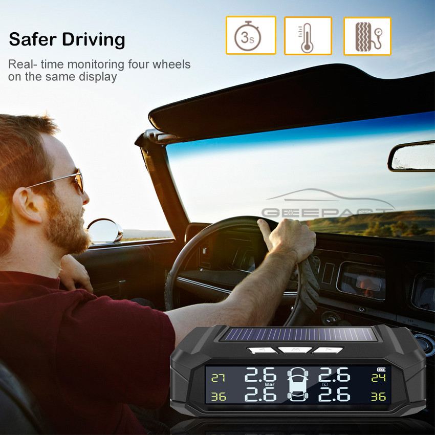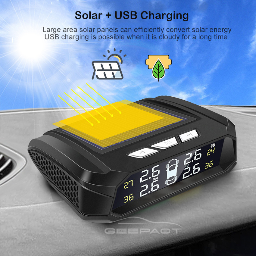 TPMS Universal Tire Pressure Alarm Monitoring System Car Tire Pressure Monitoring System Solar Panel USB Charging Smart Car with 4 External Sensors Real-time LCD Display
